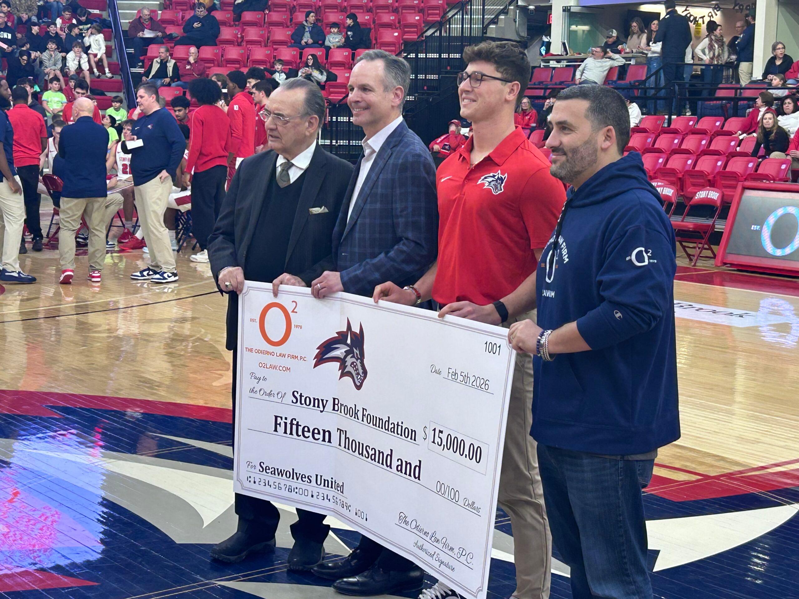 Stony Brook University celebrated the firm’s sponsorship at their 2/5/26 basketball game, and awarded this year’s scholarship to Hunter Colagrande of the Stony Brook Seawolves baseball team, in an on-court presentation with our founding partner Joseph Odierno and attorney Michael Spector. Congratulations and best wishes to Hunter Colagrande, and go Seawolves!